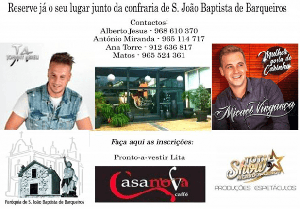 A Confraria de S. João Batista em Barqueiros está a organizar um almoço convívio, domingo, com o objectivo de angariar fundos para algumas obras a realizar na Igreja de S. João. As reservas ainda podem ser feitas junto dos elementos da Confraria. Para adultos custa 20 euros por pessoa, crianças dos 4 aos 9 custa […]